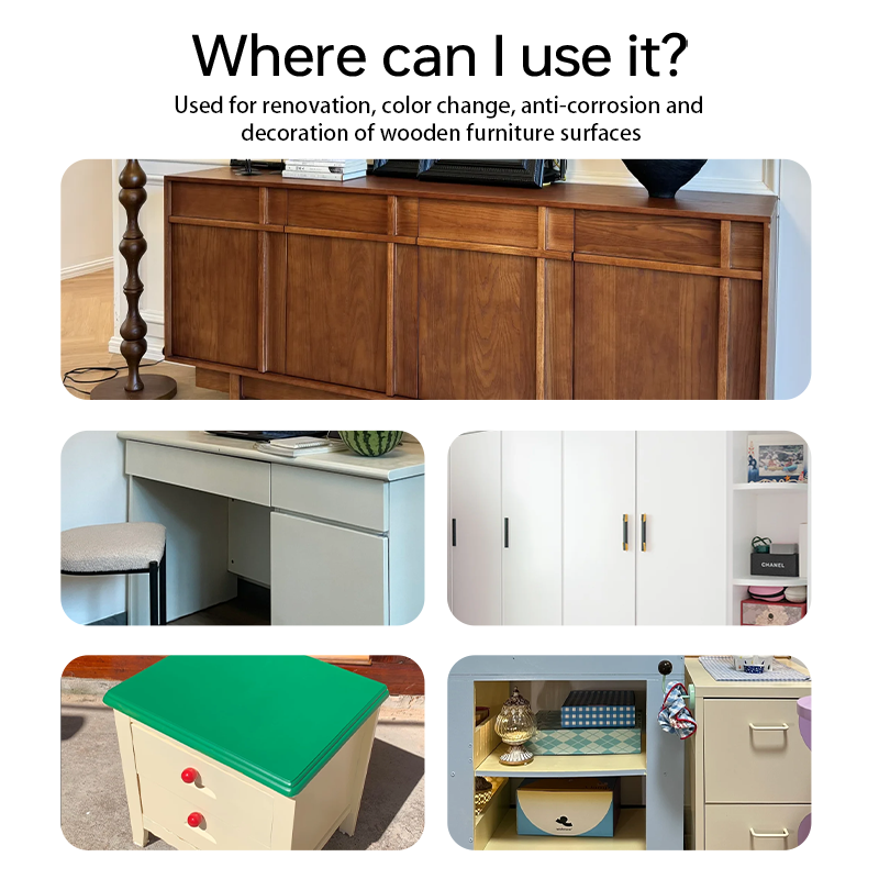 Used on wooden furniture surfaces for renovation, color change, anti-corrosion and decoration.