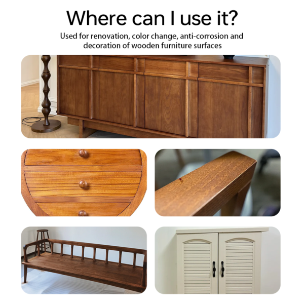 Used on wooden furniture surfaces for renovation, color change, anti-corrosion and decoration.